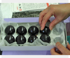 ひとつひとつ、ゴムの袋に詰めます。 | どこのどなたにこれが届くのでしょう。 召し上がる方の笑顔を想いながら箱に 詰めます。 |